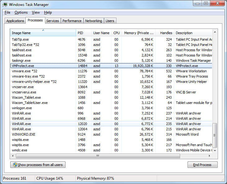 in windows task manager, memory used by vmprotect increase to 19.9G